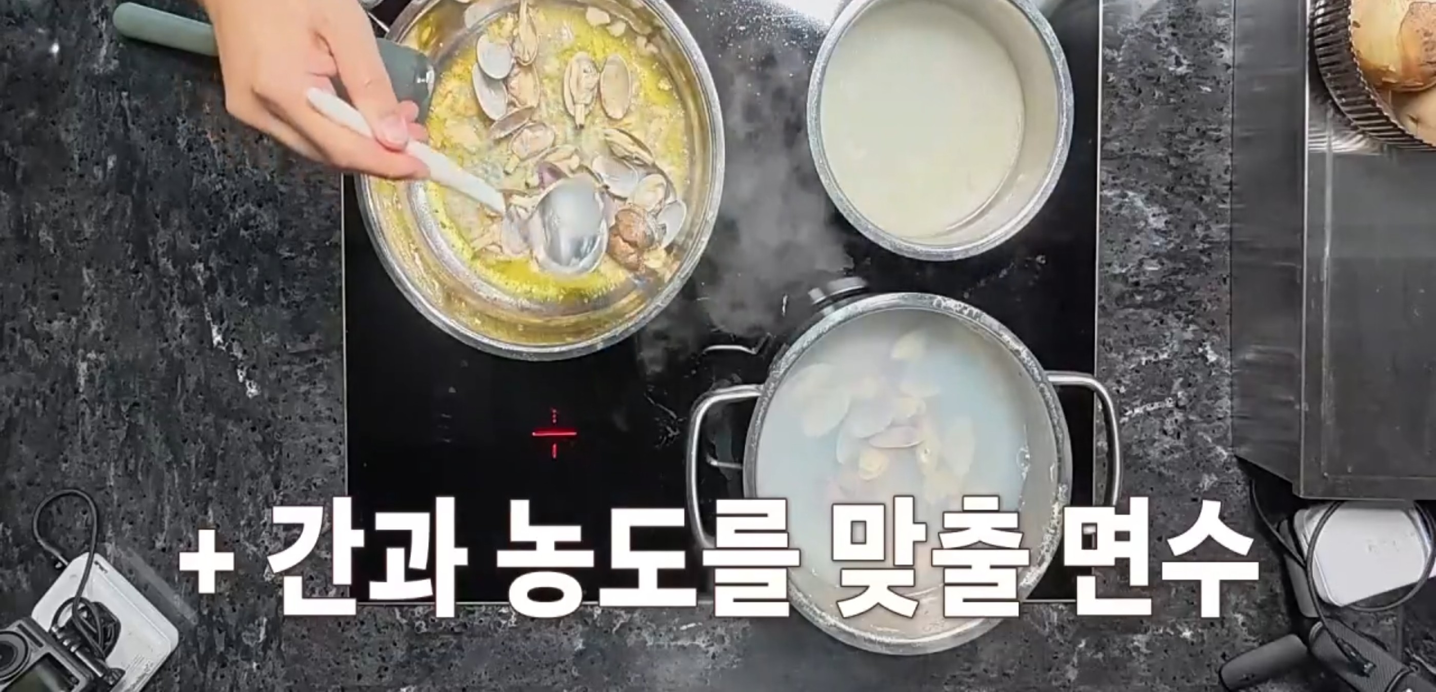 따로 받아둔 바지락 육수와 면수를 적당히 부어 풍미와 농도를 맞춰줍니다.