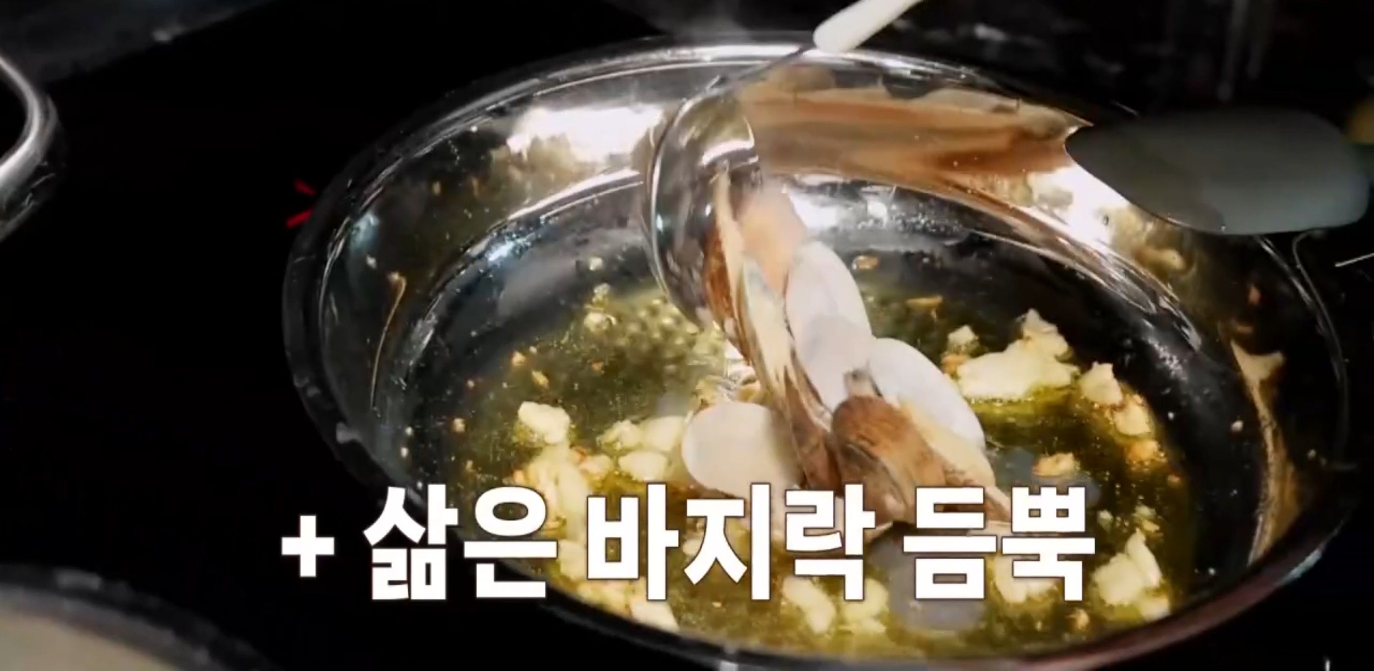 4. 팬에 올리브유를 넉넉히 두르고 다진 마늘, 삶은 바지락, 바지락 육수,